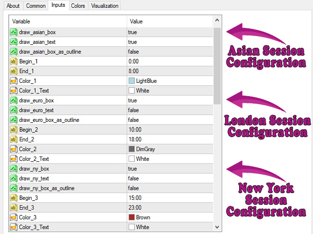 - The indicator shows when every market session starts and finishes in colored frame box.