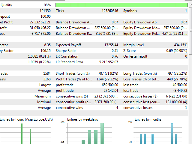 This rule works on most currency pairs, so the robot performs quite well on many pairs with a small spread. It should be noted that if you limit the robot to opening only 1 position, using a stop loss, then in a strategy tester this method may be more effective, but in real conditions, due to spread widening and slippages at times of price activity, the result may differ radically between different brokers and on different types of accounts.