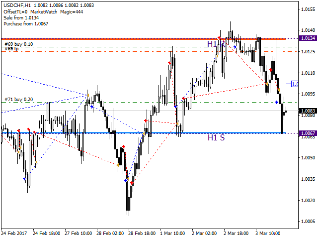 The entry level can be shifted relative to the line. It is defined by the Trade Offset in points, and can be both positive and negative. The Expert Advisor uses averaging. Step and take profit are automatically calculated according to candlestick analysis.
