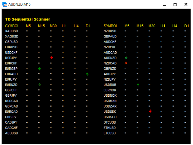 The indicator scans for TD Sequential signals in multiple timeframes for the all markets filtered and shows the results on Dashboard.