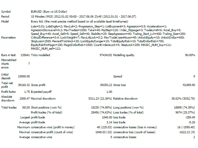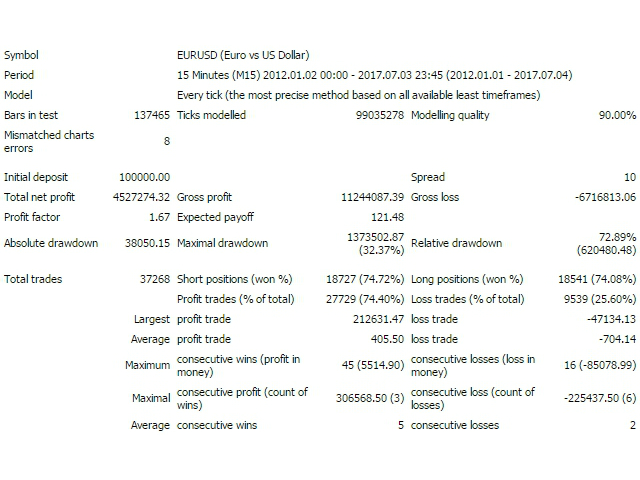 The EA has been configured to work on EURUSD (M15 timeframe), but it cans to work on any currency pairs and timeframes when the appropriate parameters are selected.