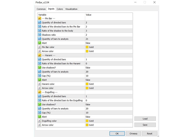 - Use shadows? – false/true. Переключатель. По дефолту = false. Что это? Этот параметр для принципа расчета паттерна. По дефолту трендовый бар должен полностью «поглощаться» разворотным именно телом. То есть тело+тени трендового меньше чем тело разворотного. Если же параметр = true, то тела двух фигур могут быть одинаковыми, но тогда приоритет будет именно на тени.