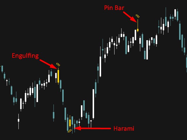 Технический индикатор "Reversal patterns" является математической интерпретацией классических разворотных паттернов: Pin Bar, Harami и Engulfing. То есть «Разворотного бара», «Харами» и «Поглощения». Данный индикатор позволяет определить момент разворота котировок на основе рыночной динамики и победителя между «быками» и «медведями».