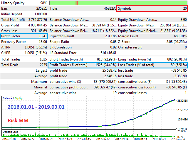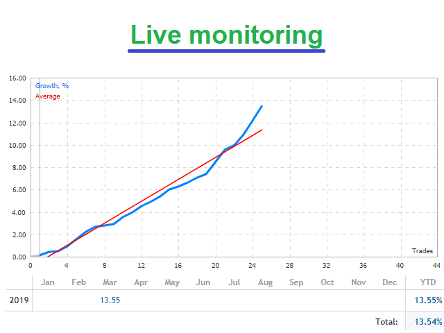 This long-term trading system works on 20 pairs and 1 timeframes. The Expert Advisor uses various trading systems, such as trend trading, countertrend trading and others. This increases the chances of sustained growth and reduces exposure to a single pair or individual operations. The risk is tightly controlled.