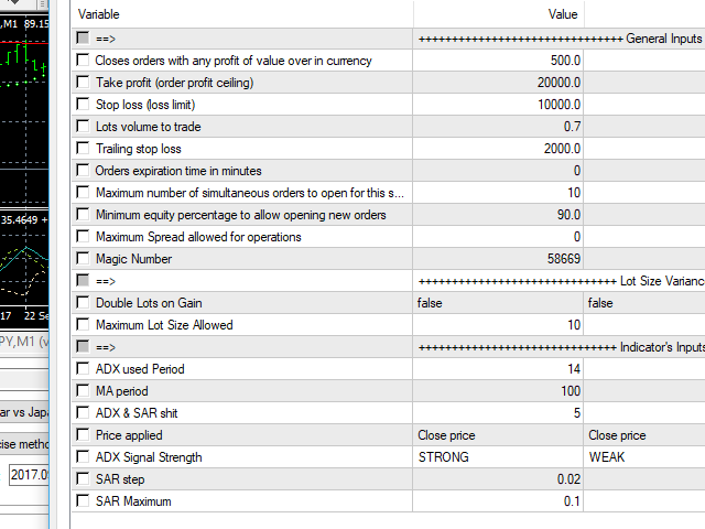 - As requested by some experienced traders, this EA's strategy uses its 2 built-in indicators to enhance its signals and decide to open a new order at the right time, there is an ADX indicator and you may choose its signal's strength, a parabolic SAR to help and confirm the trends and a MA to check if the prices are deviating from its pattern. By joining both indicators' data and the moving average, it is possible to calculate a good and strong trend direction, avoiding sudden market movements against your trading operations;