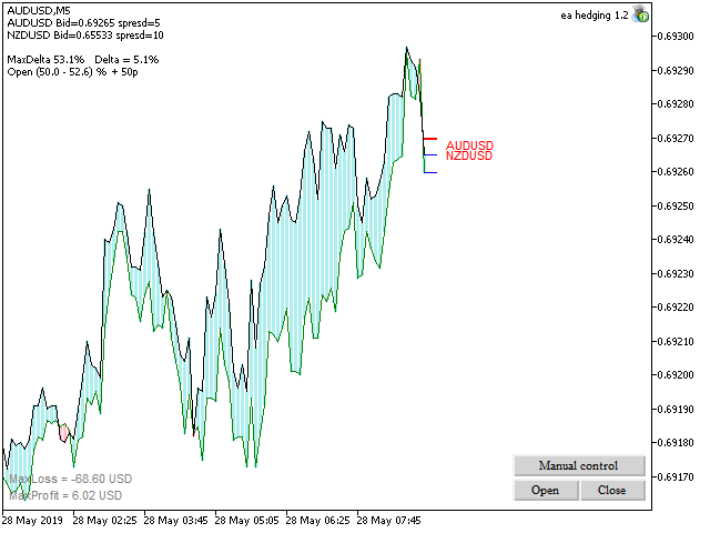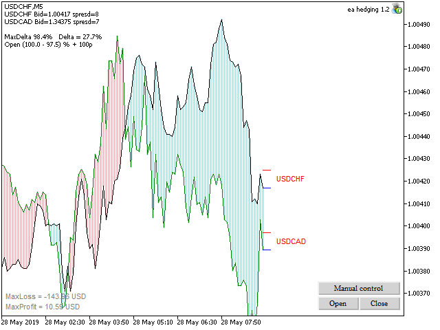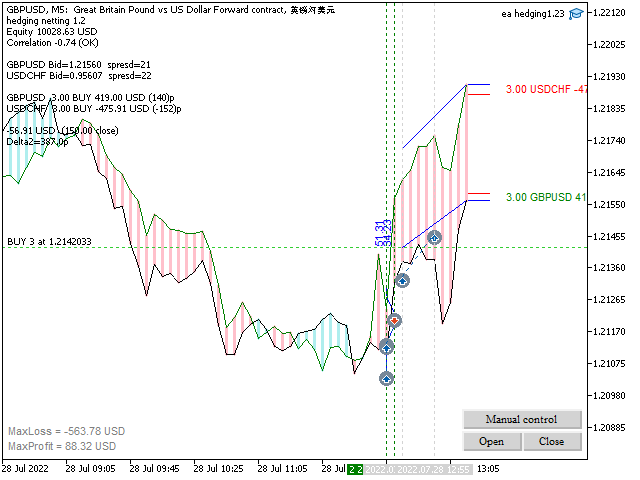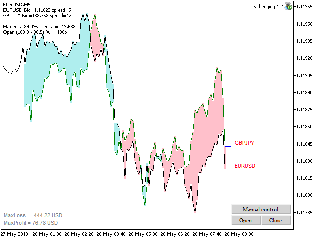 如果您愿意,您可以将EA转移到手动交易。要做到这一点,在右下角有三个按钮手动-将EA置于手动模式。 同时他不开仓或平仓。打开按钮将打开两个仪器在Delta收敛方向的一对计数器位置。关闭按钮关闭所有仓位。