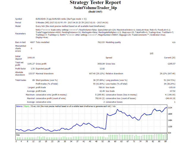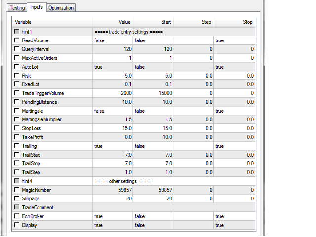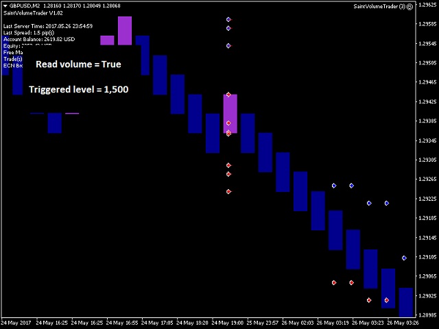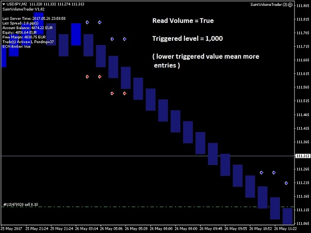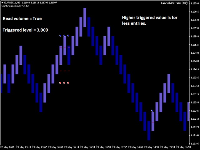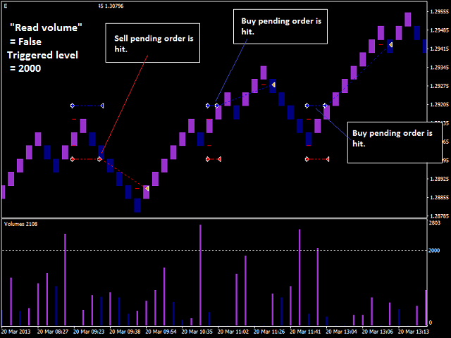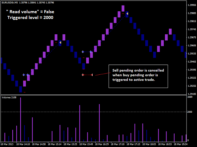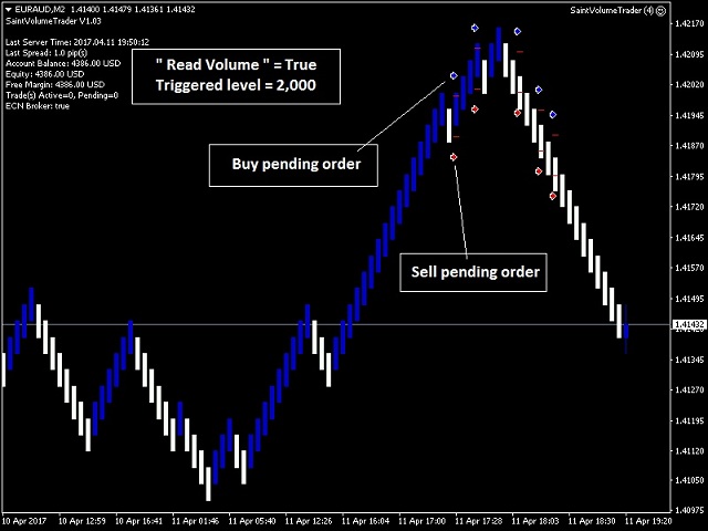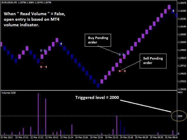 Saint Volume Trader EA consists of the two sets of strategy. When "read volume" parameter is on, the EA trades with special build-in software to extract volume data from the data provider. Data provider updates real time data for every two minutes. When "read volume" set to false , the EA trade with standard MetaTrader 4 volume indicator. Both strategies have the same concept to read aggregated volume figures from the standard MetaTrader 4 volume indicator or data provider on a certain timeframe. By presetting a value requirement for opening a trade in the "trigger level" parameter, the EA will place buy/sell pending orders when the requirement value is met. Either buy or sell order is hit, the opposite one will be canceled. Below are basic information and EA's parameters.