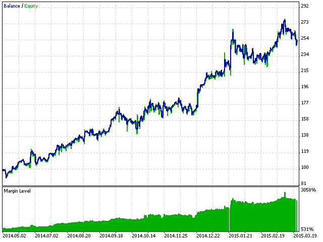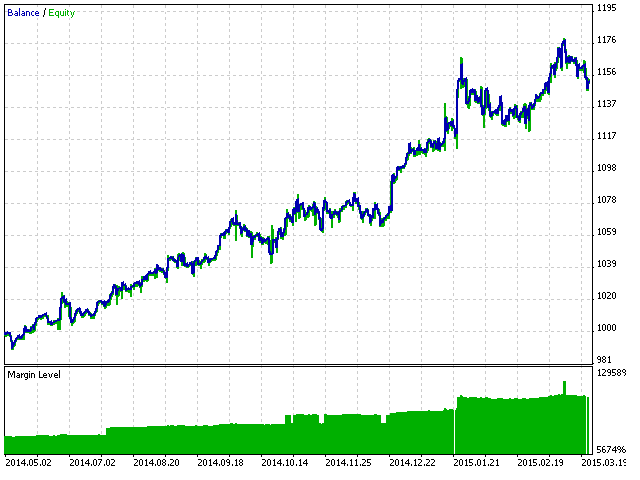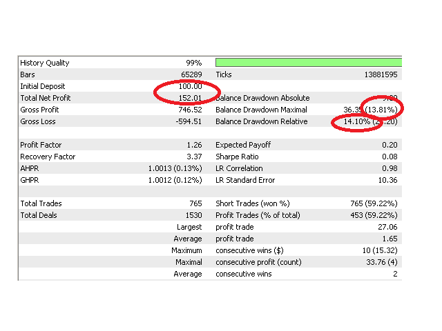 The default settings provide one-direction operation - only Buy. The EA has been tested on EURUSD on the data for more than a year. Testing showed that the EA makes 150% per year with a maximum drawdown of 18%. It is shown in below figures. You can try to find profitable combination of other currency pairs, but separately for Buy or Sell and then combine into a multicurrency Expert Advisor.