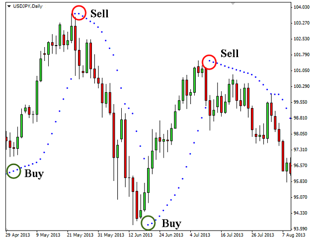 Signals are produced by one indicator Parabolic SAR (Parabolic Stop and Reverse system). It has only one buffer. The entry signal is generated when the indicator direction changes. When points over the price no longer appear, and the first point appears below the price - this is a buy signal. If points below the price no longer appear, and the first point appears above the price - this is a sell signal (featured in the screenshot).