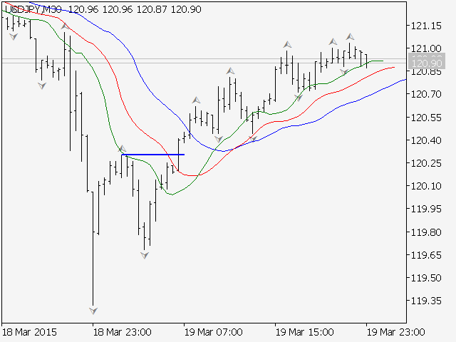 Stop loss with a buy trade should be set under the lowest low below the blue line. Stop loss for a sell trade should be set on the highest high above the red line. The color change of the line notifies the trader about a trend change. All the fractals and their breakouts that are located between these lines do not represent the change of trend. If the line appears on a larger timeframe, it has a higher priority than the smaller ones. When the line is formed on the daily chart, the trader should look for buying/selling opportunities on the smaller timeframes.