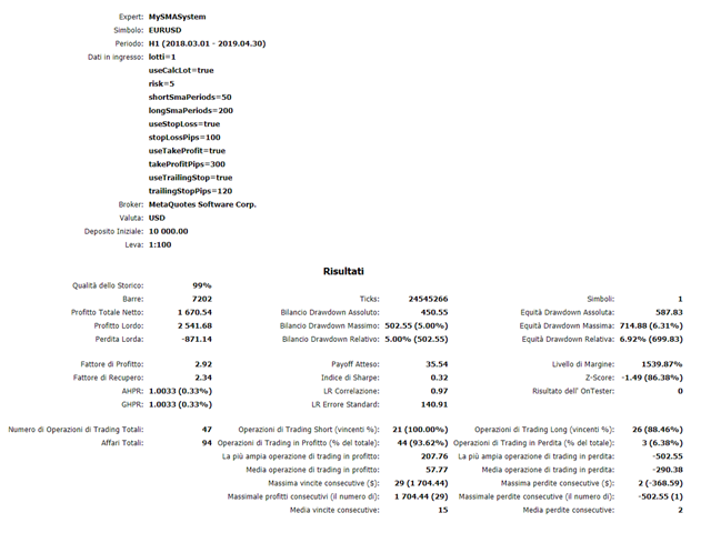 Trading signals are calculated using sma moving averages and last candle - the H1 period.