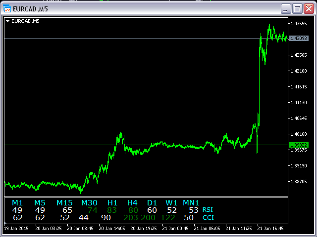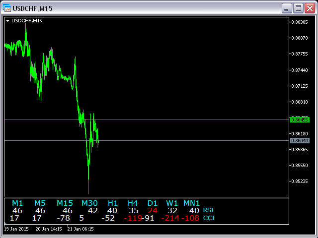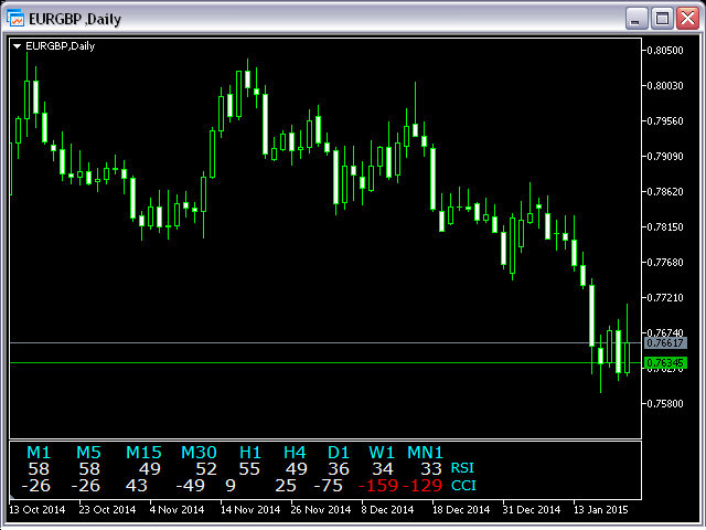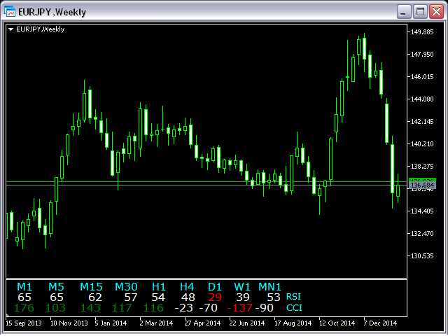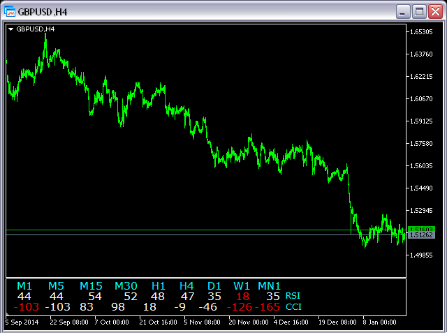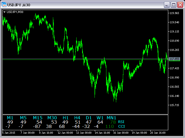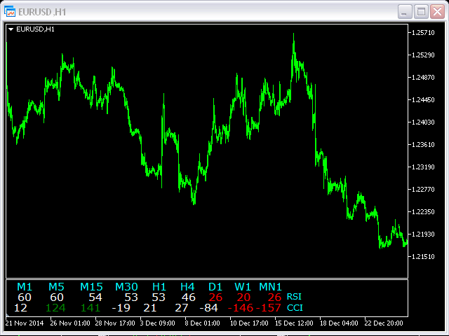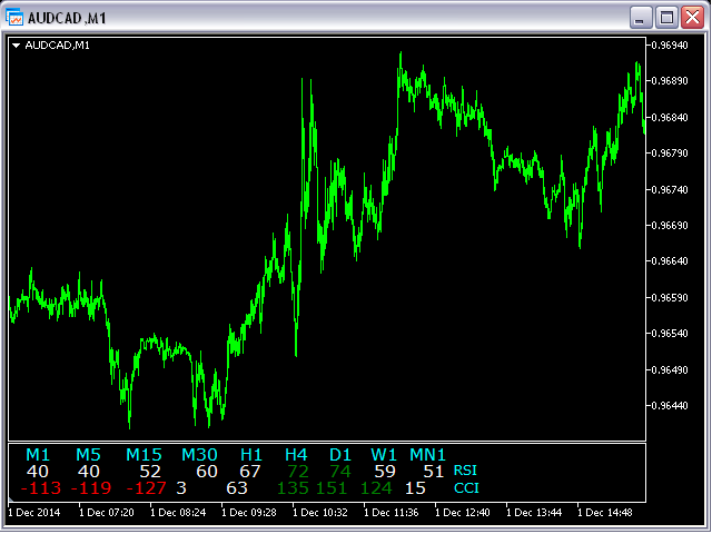 This indicator is based on the classical indicators: RSI (Relative Strangth Index) and CCI (Commodity Channel Index) and will be helpful for those who love and know how to use not a visual but digital representation of the indicators. The indicator shows values from each timeframe.