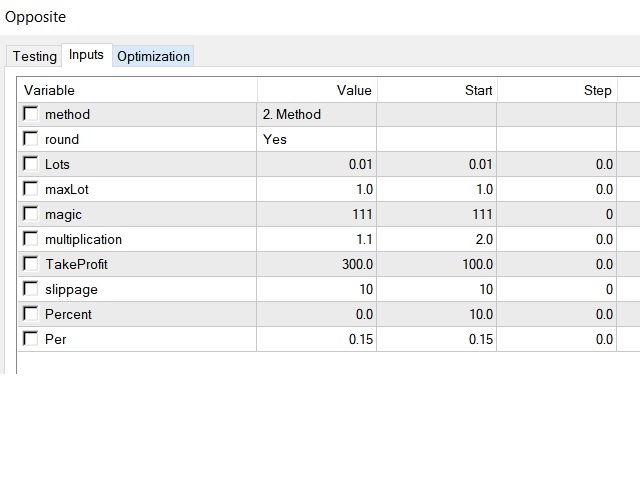 - Per: close orders in direction of higher lot size when reaching the profit calculated by TakeProfit times Per, example: Per=0.5, TakeProfit=300, then the positions will be closed after 150 winning pips.