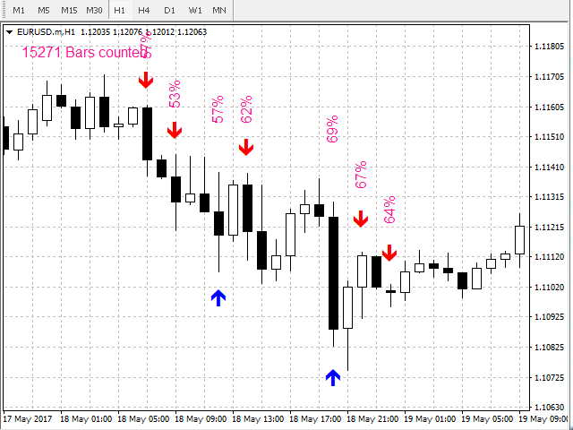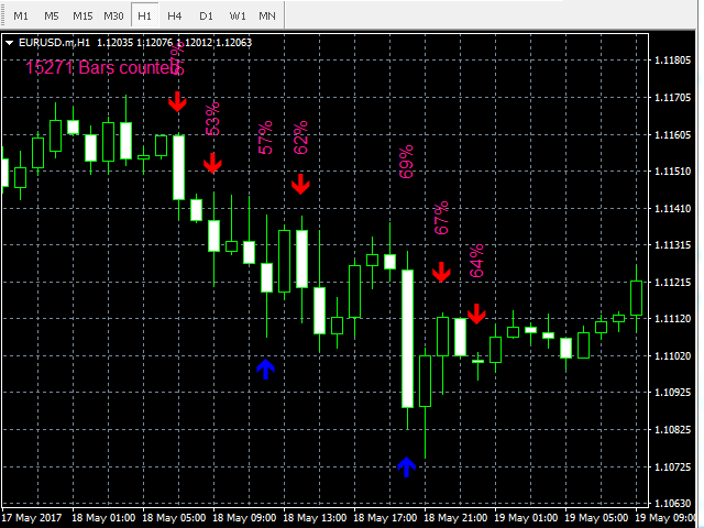 Before launching the indicator, it is recommended to download the instrument's history or to scroll the chart 10 000 - 20 000 candles back (this is done quickly on the minimum scale). The indicator calculates the probability of price movement, as well as the theoretical and practical expected values of the trading results with consideration of the specified spread. Signals are generated only if the probability of upwards or downwards price movement is greater than the one specified in the settings and if the expected value of the trading result in that direction is greater than 0. The expected value of the trading result is displayed in points and depends on spread specified in the settings. Increasing the spread in the settings increases the accuracy of signals and decreases their amount. On the contrary, decreasing the spread decreases the accuracy of signals while increasing their number. It is recommended to specify a spread greater than the average spread on the instrument.
