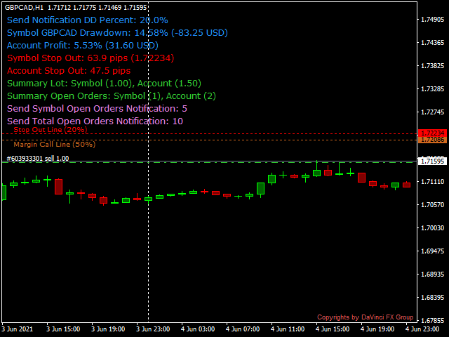 - Choose Symbol to Send Notification - select orders for calculating the drawdown and the number of open orders (of the current pair or all symbols).