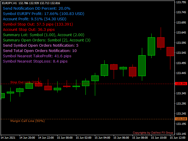 - Show Alert - display an alert on the chart when the specified drawdown or the number of open orders is reached