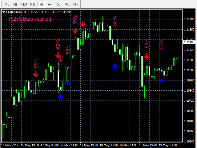 Before launching the indicator, it is recommended to download the instrument's history or to scroll the chart 10 000 - 20 000 candles back (this is done quickly on the minimum scale). The indicator calculates the probability of price movement, as well as the theoretical and practical expected values of the trading results with consideration of the specified spread. Signals are generated only if the probability of upwards or downwards price movement is greater than the one specified in the settings and if the expected value of the trading result in that direction is greater than 0. The expected value of the trading result is displayed in points and depends on spread specified in the settings. Increasing the spread in the settings increases the accuracy of signals and decreases their amount. On the contrary, decreasing the spread decreases the accuracy of signals while increasing their number. It is recommended to specify a spread greater than the average spread on the instrument.
