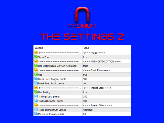 - Trailing Stop, Break Even, MA Filter, ADX Filter, Support and Resistance Filter, Spread Filter, Filter for Quiet Markets