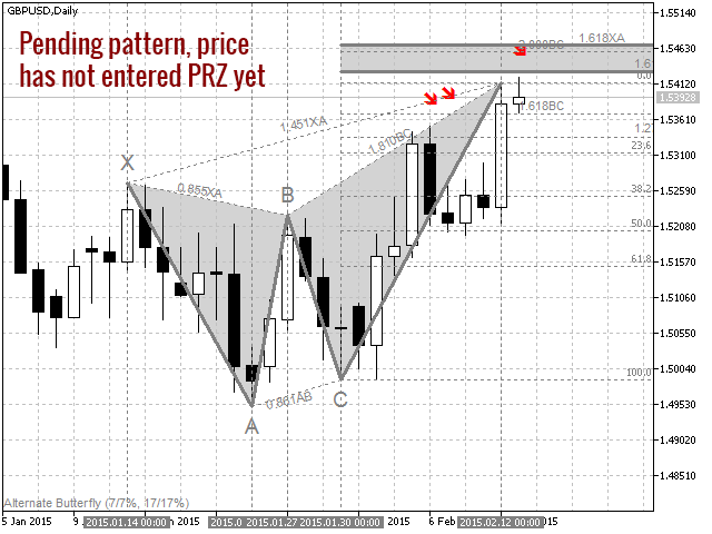 - Pending pattern is the one that has completely formed - the candle representing the D point is closed and already in the PRZ.