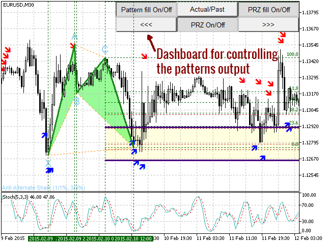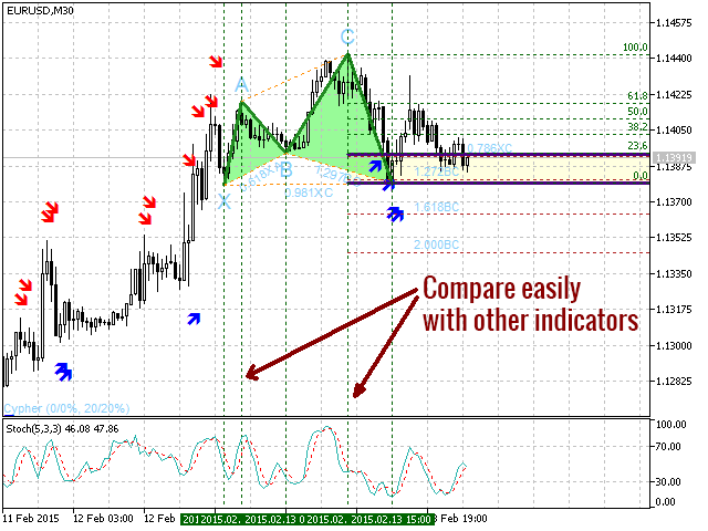 This indicator searches for all possible alternatives . This means that you can see all the potential and pending patterns found on a current candle . It is a usual situation when there are multiple pattern candidates at the same time - you can see them all!