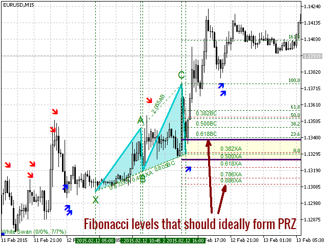 - PRZ tolerance (in percents of XABC height) : This option regulates the precision of price reversal zone (PRZ). For example, if this is set to 10%, then it is allowed for levels that define the D point to have an absolute error of 0.1*height(XABC). The cross-section of those levels comprises the PRZ. The closer this value to 0%, the narrower will be the PRZ, and accordingly the less patterns are found.