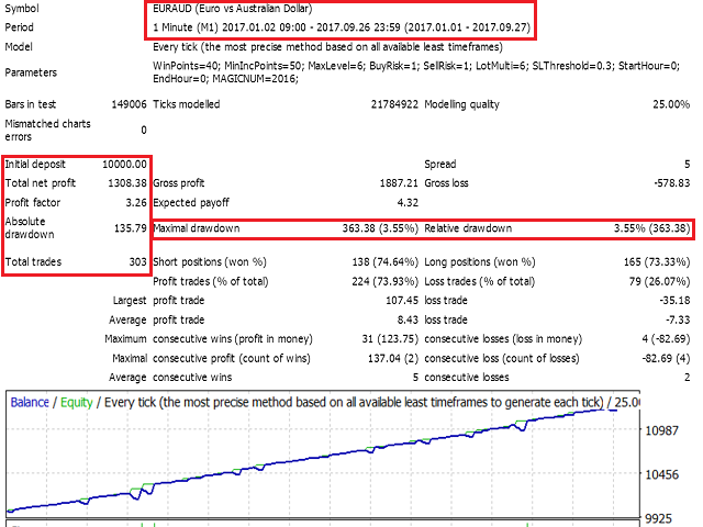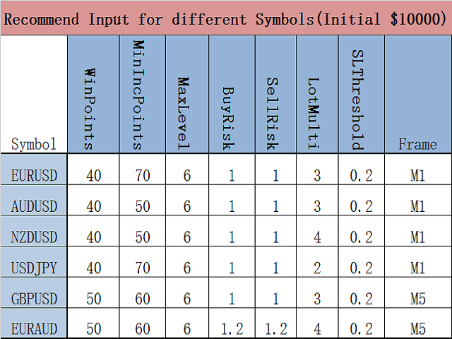 - 针对不同的货币对,EA自动匹配不同参数。已经优化并实盘验证的货币对有:EURUSD,AUDUSD,USDJPY,NZDUSD,EURAUD,GBPUSD。