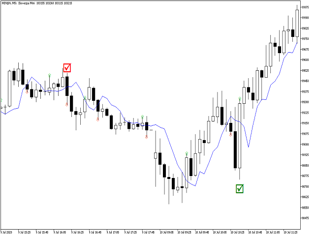 When there's a sell signal instead, place a sell stop order one tick below the low of the candle with the sell signal, and a stop loss one tick above the candle's high.