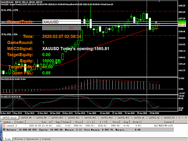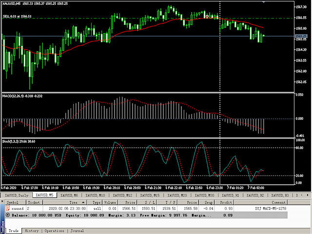 Signals to sell are generated if the MACD line crosses under the SIGNAL line in the positive area above the MACD open level, and when Stochastic has crossed InpStochOverbought upwards, reached InpStochOverbought, and then crossed back down through InpStochOverbought.