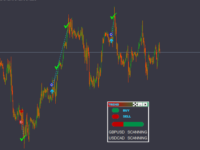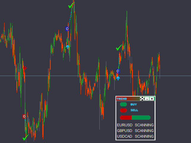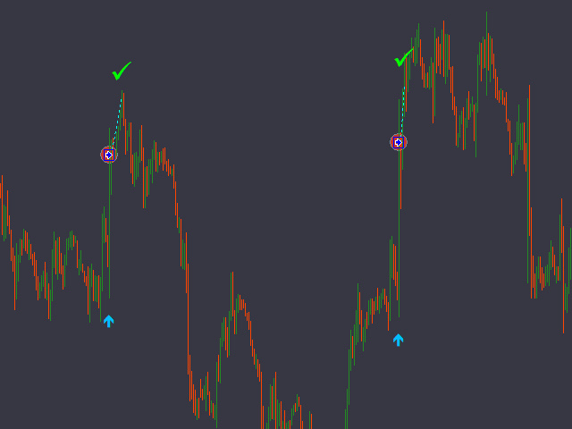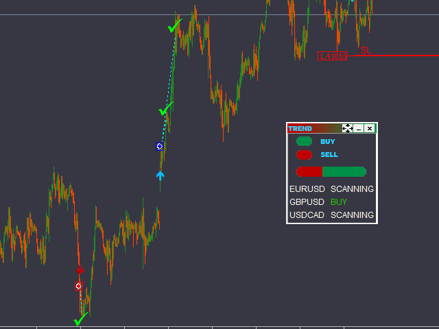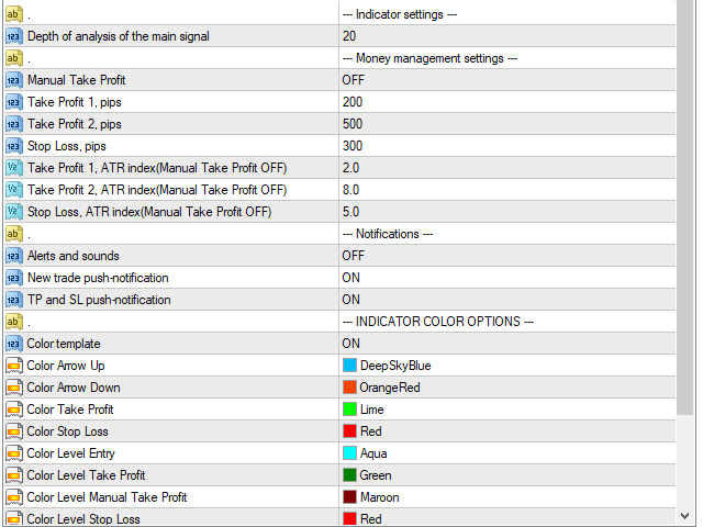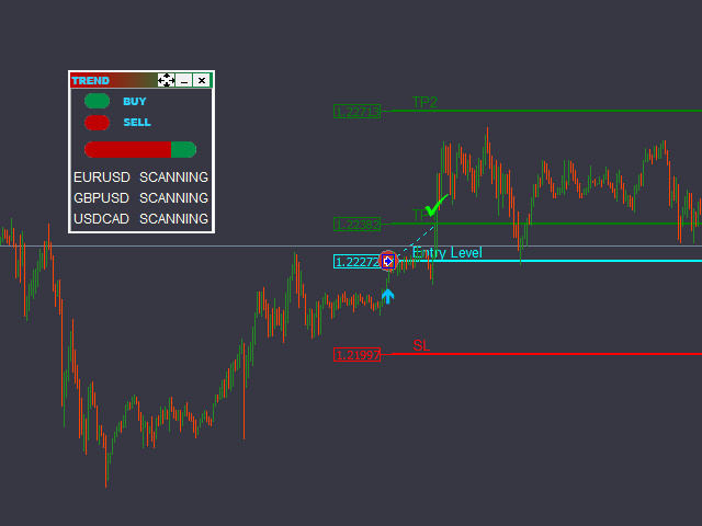 - In addition to the entry point, the indicator shows the entry level as well as the Stop Loss and Take Profit levels.