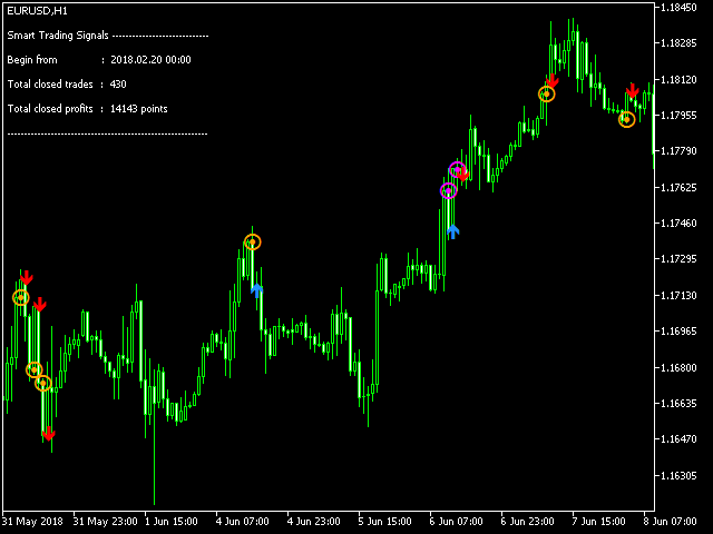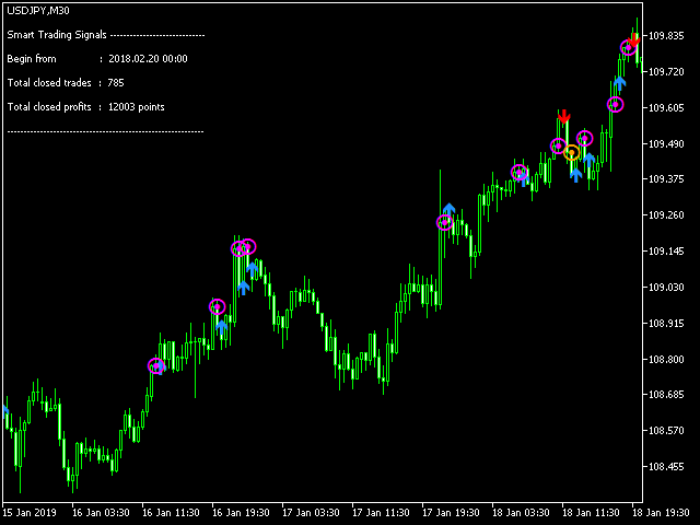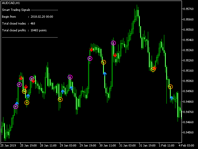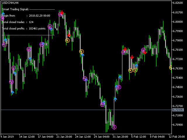 这是一个会自我学习的指标。你需要设定一个起始时间,并下载相应的历史数据,让它进行学习。学习的规则限制尽量少,给予指标最大的自由度。因此,以学习期间的最佳结果为选取原则,并不保证每次交易都是盈利的。通常而言,学习时间越长,结果越可靠。在策略测试器中,你需要设定时间参数,早于测试开始的时间,以便让指标有充足的学习时间。指标会发出买入或者卖出的信号,以箭头的方向作出区分。指标亦会发出关闭信号,以不同颜色的圆点作区分。