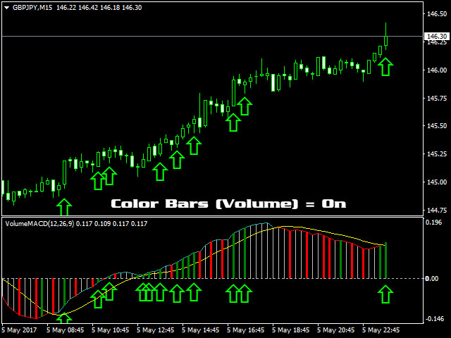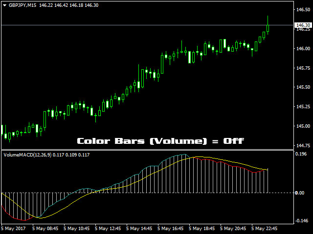 If set to Color Bars (Volume) = On , the MACD histogram bars are colored when the tick volumes increase: by default, a bullish bar with an increased tick volume is colored in green, while a bearish bar is colored in red. If the volume does not increase, the histogram bars are not colored.