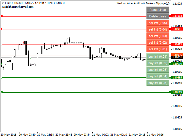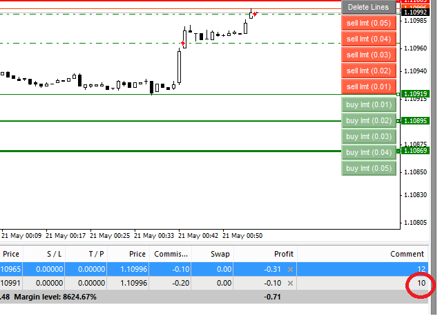 Sell Limit and Buy Limit buttons draw lines of sell or buy limit with a same lot specified in the EA Lot properties.
