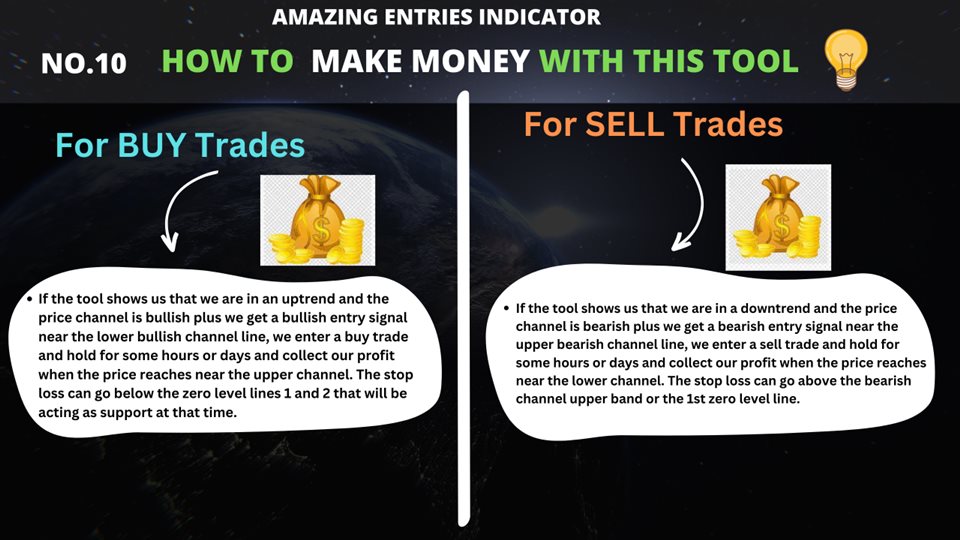 - If the tool shows us that we are in an uptrend and the price channel is bullish plus we get a bullish entry signal near the lower bullish channel line, we enter a buy trade and hold for some hours or days and collect our profit when the price reaches near the upper channel. The stop loss can go below the zero level lines 1 and 2 that will be acting as support at that time.