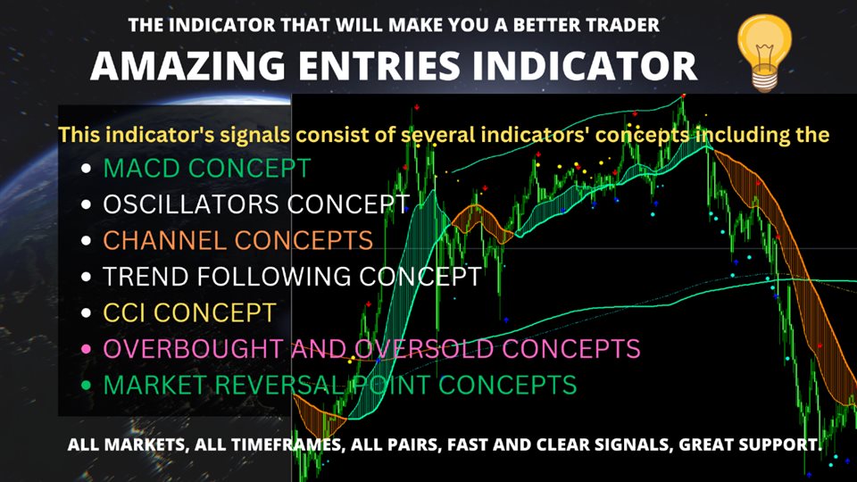 Dear Traders, I am always working to come up with tools that may help you to become a better trader and investor. Due to my experience in trading and market analysis and trading software design and development, I am glad to introduce to you my other tool called " Amazing Entries Indicator ". The Indicator is
