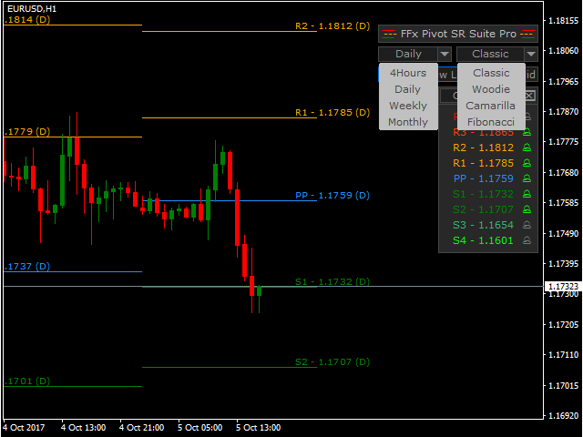 - 4 formulas to choose for the calculation: Classic, Camarilla, Fibonacci and Woodies