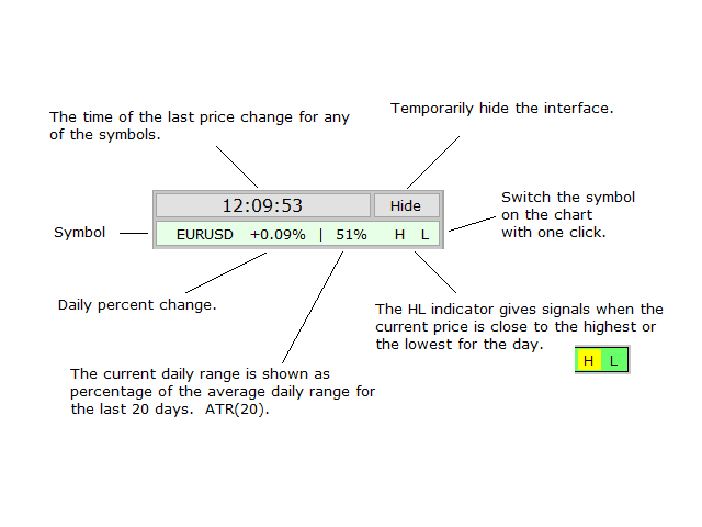 - H L indicator - give signals when the current price is close to the highest or the lowest for the day.