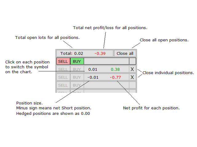 - Trading interface - simple buttons for trading with one click plus basic position information including position size and net P/L.