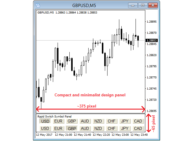 There are two rows of buttons at the panel. To switch to a new chart symbol, all you need to do is select a currency from each row. It is not necessary to click the currencies in a correct sequence because it is designed to auto match your choice of currencies to the available symbols. For example, just click on GBP button at either rows and USD button at the other row if you want to switch to GBPUSD.