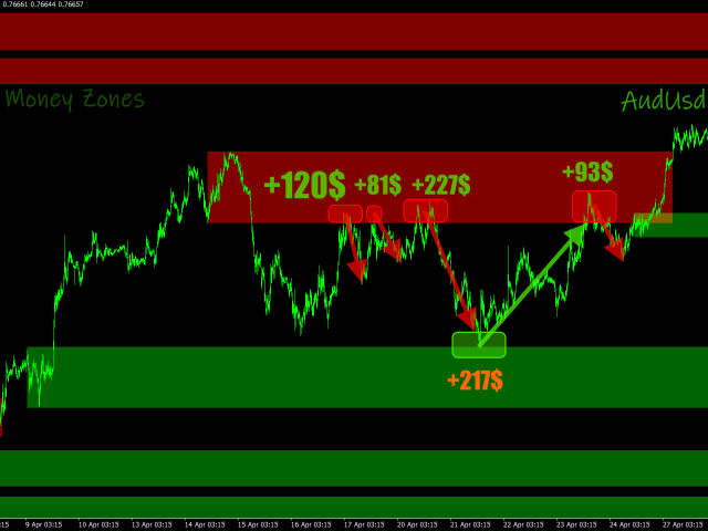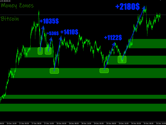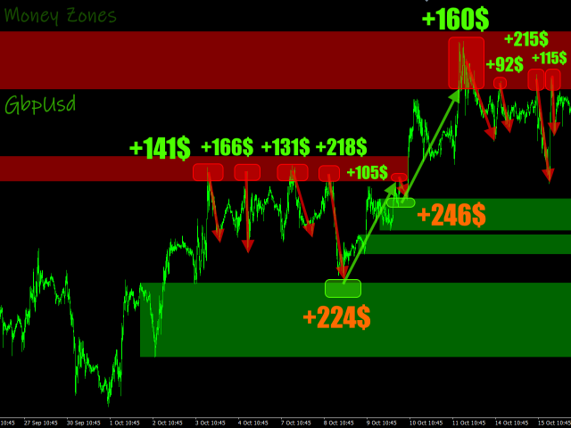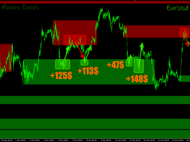 is an indicator that determines accumulation/distribution zones in the market. Green zones make it possible to look for buy entry points or sell exit points. Red zones, on the contrary, define the opportunity for selling or closing buys. The indicator has the ability to define money zones for two timeframes simultaneously on the same chart.