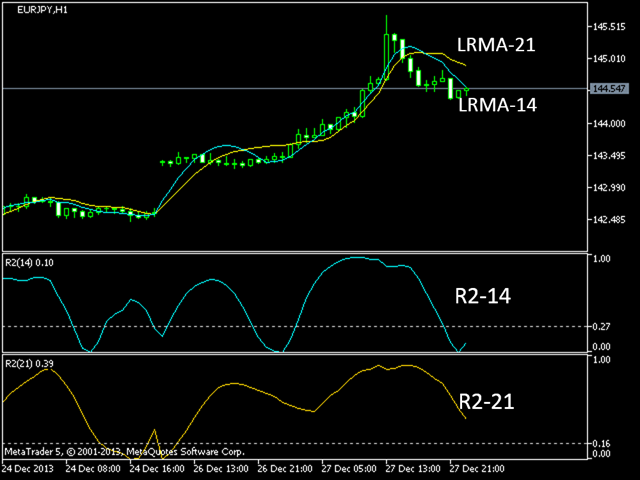 period R2 value (95% confidence) 5 0.77 10 0.40 14 0.27 20 0.20 25 0.16 30 0.13 50 0.08 60 0.06 120 0.03The usefulness of this indicator increases when used with the linear regression slope indicator that reports the direction of the trend, while R2 informs us of the strength of the trend.