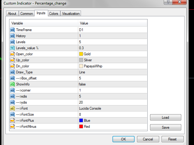 - Corner - chart corner to display the daily, weekly and monthly change text (0: Top Left / 1: Top Right / 2: Bottom Left / 3: Bottom Right).