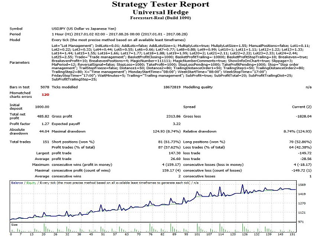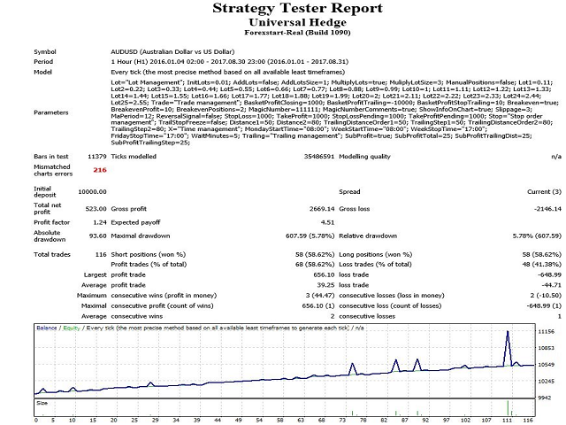 The Universal HedgeEA opens positions according to time management and the SMA Moving Averages filter that are set by users. Closing positions is set according to take profit and trailing stops. The EA has a unique feature that minimizes the gap feature used by standard hedging strategies. This feature allows stop orders to move with the market up to the initial position. This feature can also be overwritten so that the stop order can trail the market.
