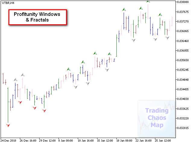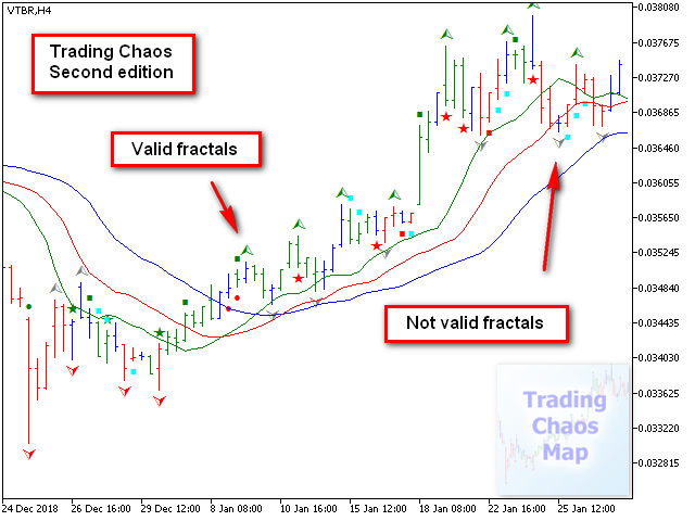 - Рисует сигналы "третьего мудреца" - фракталы, обозначая действительные и недействительные сигналы разными цветами.