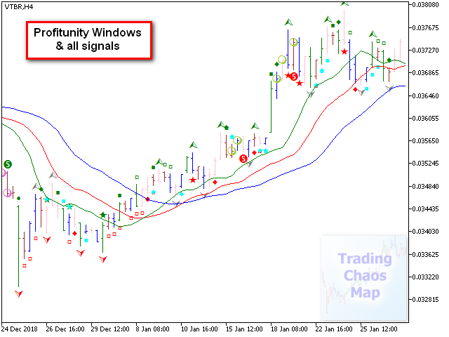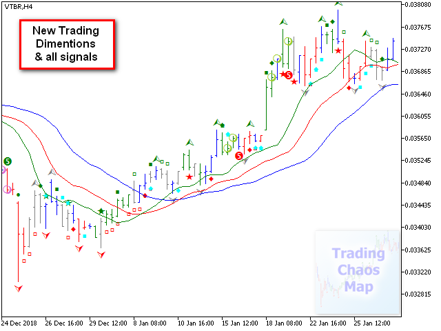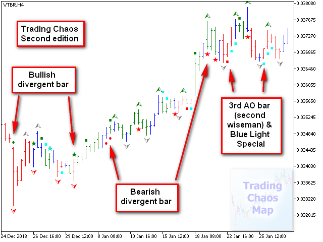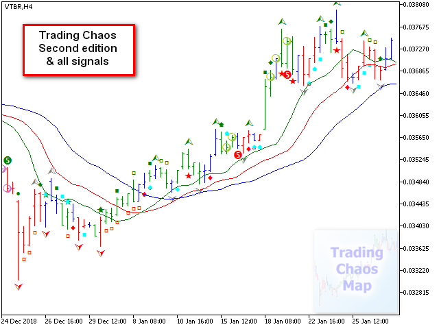 - Идентифицирует сигнал "первого мудреца", а также выделяет звездой сигнал, усиленный конфигурациями баров, описанными в первой книге "Торговый Хаос".