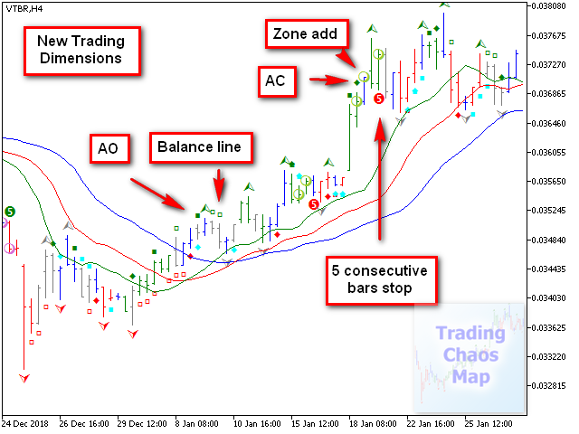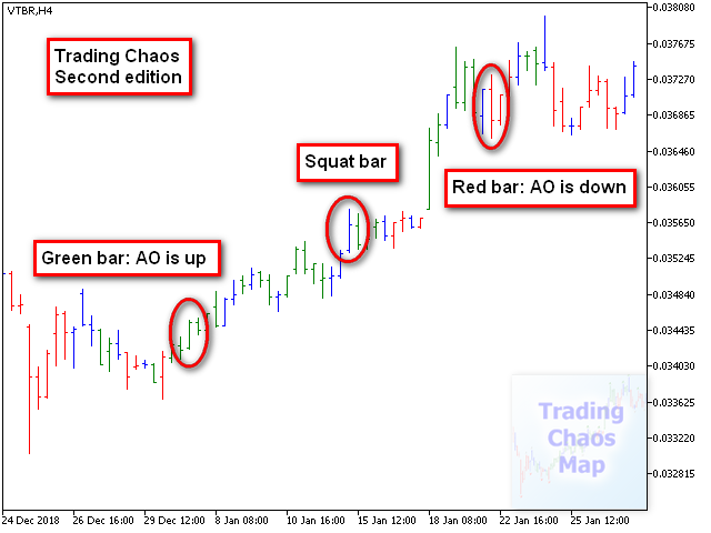 - Раскрашивает бары в определенные цвета в соответствии с выбранной методикой. New Trading Dimensions - зелёный, красный, серый по цвету "зоны", синий - "приседающий". Trading Chaos - зелёный, красный по цвету индикатора АО, синий - "приседающий". Также введен режим Profitunity Windows, который будет полезен для новичков, только изучающих методику и начинающих торговлю на бирже, а также для опытных трейдеров. Зелёный - "зелёный" бар, коричневый - "увядающий", синий - "фальшивый", розовый - "приседающий". Описанные цвета установлены по умолчанию, их можно изменить во вкладке "Цвета" параметров индикатора.