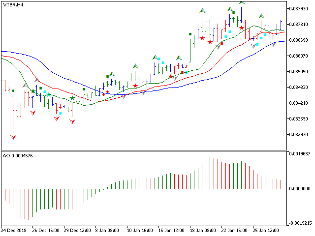 - Показывает сигнал "второго мудреца" - три последовательных бара осциллятора АО одного цвета.