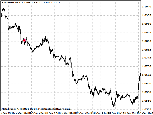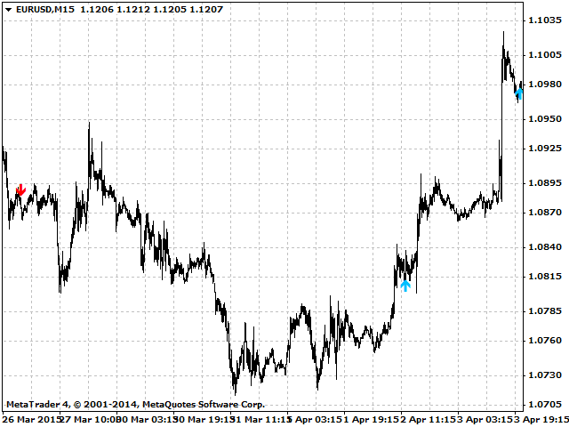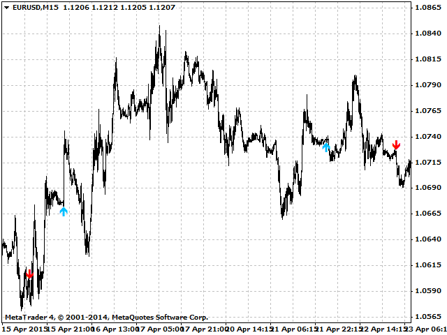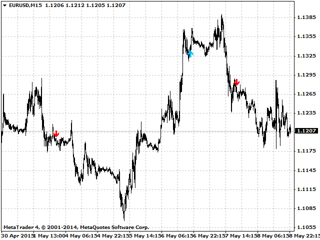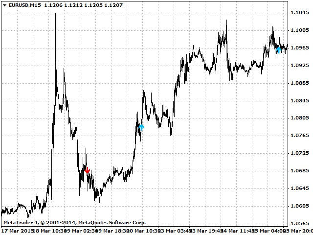The indicator draws an up arrow when it detects a pattern which assumes further upward movement of the indicator. Similarly, the indicator draws a down arrow when it detects a pattern which assumes further downward movement of the indicator.
