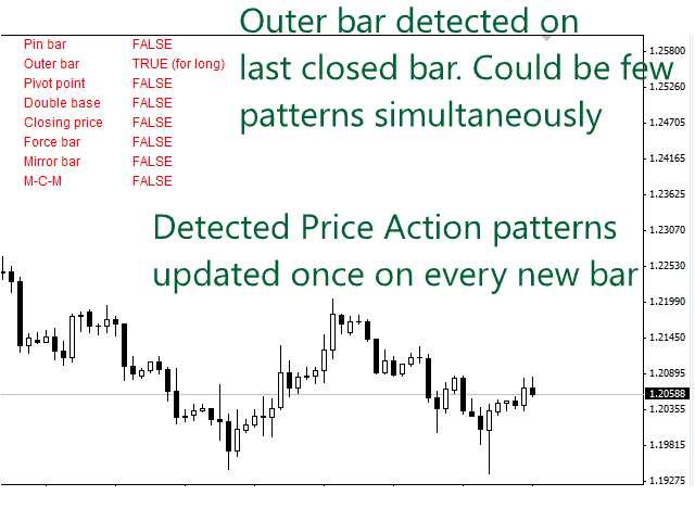 The indicator automatically analyzes recently closed candles, and notifies if they form any of the Price Action patterns. The following classical patterns are analyzed: