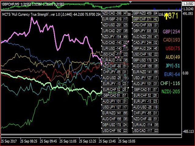 This indicator shows multiple individual currency strengths as measured against all the other currencies from a starting point which is the timeframe. It measures the price movements of the applied chart currency pair comparing the base and counter currency occurring in all the other base/counter currencies and shows the strength movements.