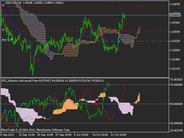 本指标基于标准的 MT5 Ichimoku Kinko Hyo 指标,但我已经将它设计为跟踪其它数值 (RSI, CCI, Momentum, TEMA, ...),且替换至子窗口。